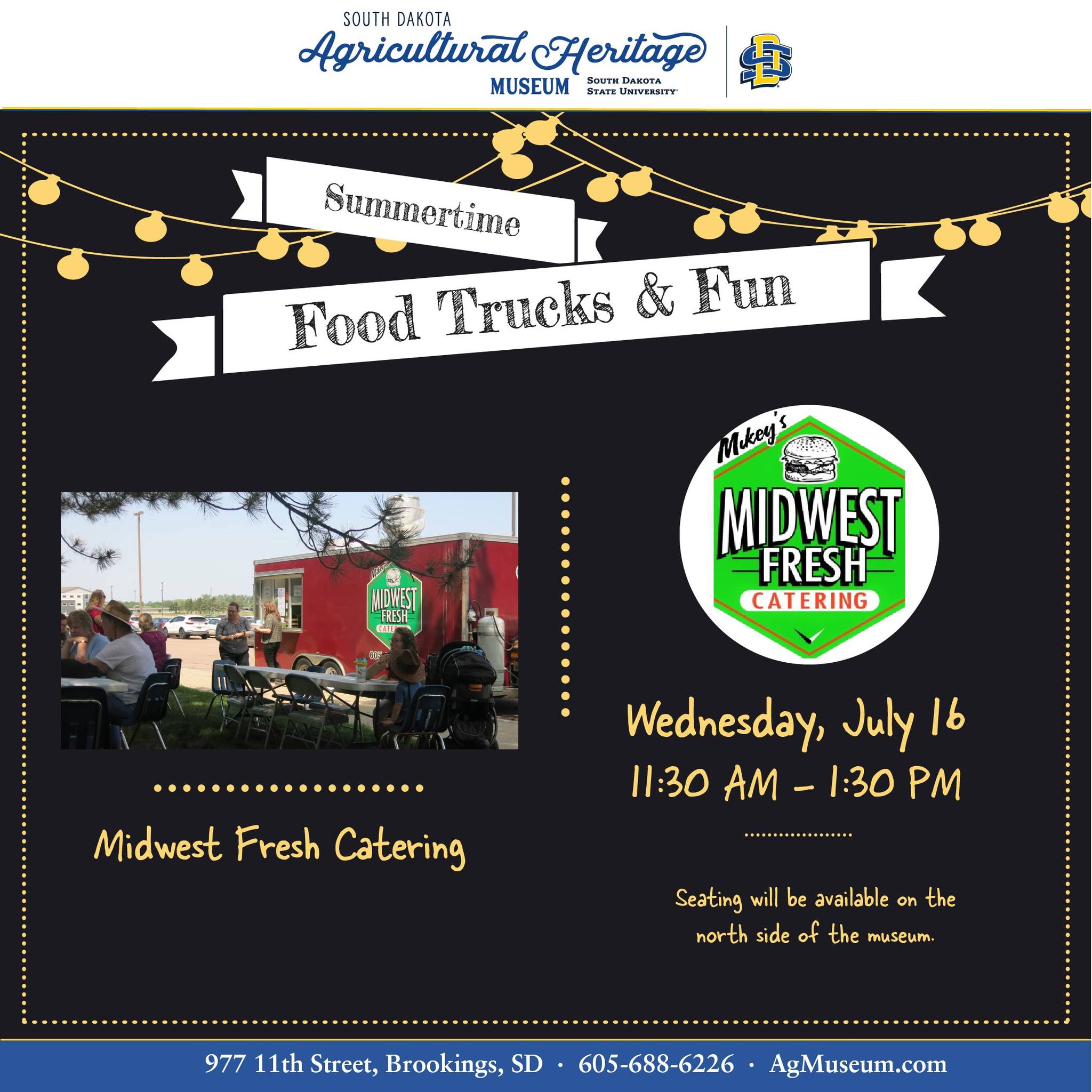 In case you missed them, Midwest Fresh is back on July 16 from 11:30 AM to 1:30 PM. Limited Seating available behind the South Dakota Agricultural Heritage Museum on the north side. Plenty of parking. In case of inclement weather, check our social media channels for plans to move indoors.
