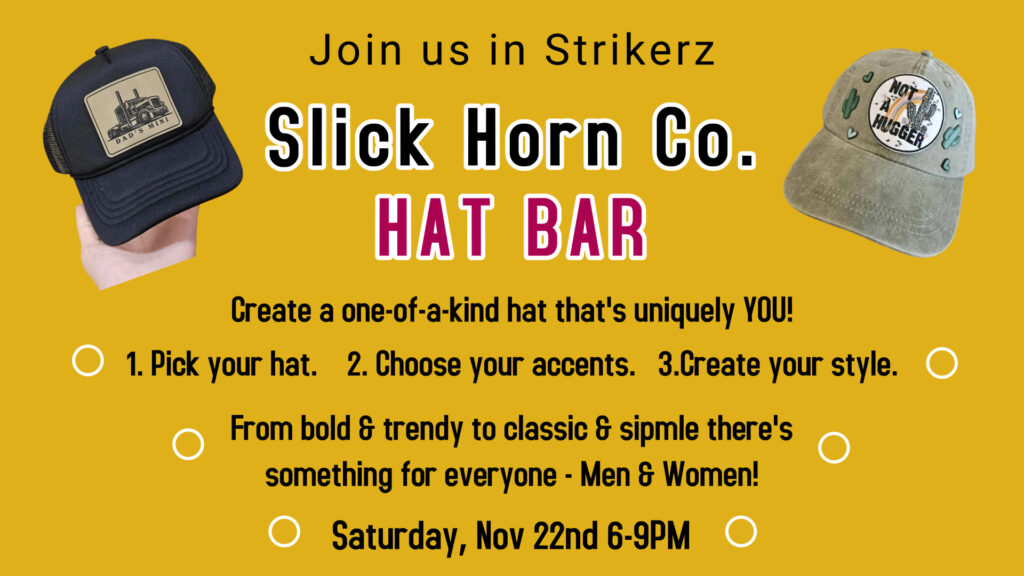 Head over to Strikerz Bar & Grill at The Lanes to create a one-of-a-kind hat that's uniquely YOU! It's simple! 1. Pick your hat. 2 Choose your accents. 3. Create your style. From bold and trendy to classic and simple, there's something for everyone.