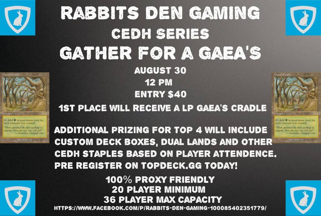 CEDH Tournament Announcement100% Proxy-Friendly | Competitive REL Doors Open: 11:00 AMTournament Starts: 12:00 PMEntry Fee: $40Location: Rabbit's Den Gaming, Downtown Brookings, SD Registration Requirements: Pre-registration and decklist submission are required via =AT17N_E2hdh4l2gcEErln-k6RZfAdBA8rAxJNlXqRxA65PJKSxIhNFNgrzO9f-UFf-Q6xauyycQrQ6XIVbvecMKUBadmW7tFxmQYvcI2jG8mOlCqtCgA42G71Fdh6V-Zhh5__TIbVIzwkVauaGJpCs8D0QSroflKfHo" target="_blank" rel="nofollow noopener noreferrer">Topdeck.gg link] If proxies are used, a Moxfield link must also be submitted alongside your decklist. All proxies must be clearly […]